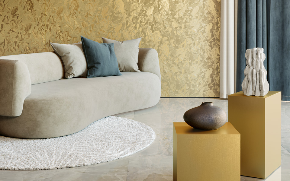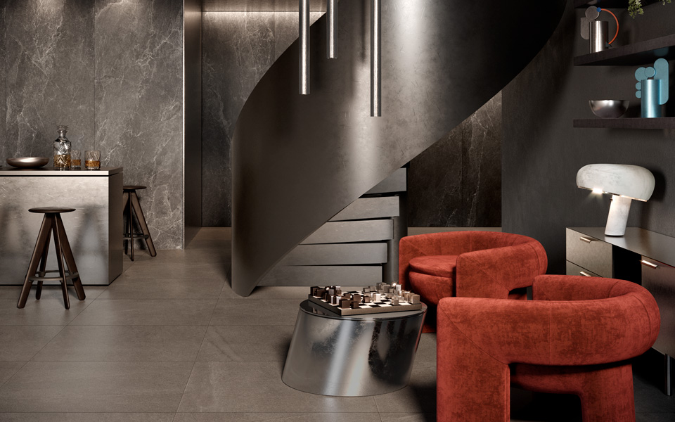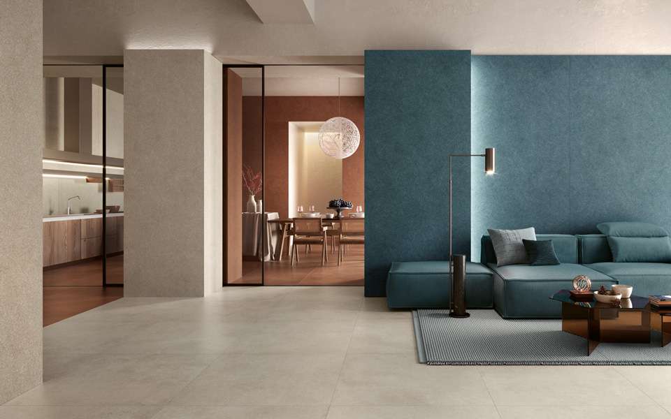 As a wall covering, marble- or concrete-effect finishes are ideal for structuring the space and defining a contemporary style without compromising visual comfort.