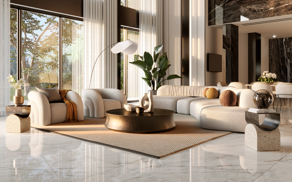 Porcelain stoneware is highly valued for its ability to perfectly replicate natural materials such as wood or stone, without the maintenance constraints. Using large-format flooring helps reduce visible joints, creating a seamless surface that visually lightens the room. This visual continuity enhances the sense of openness and lays the foundations for a living room design that is both modern and cosy.