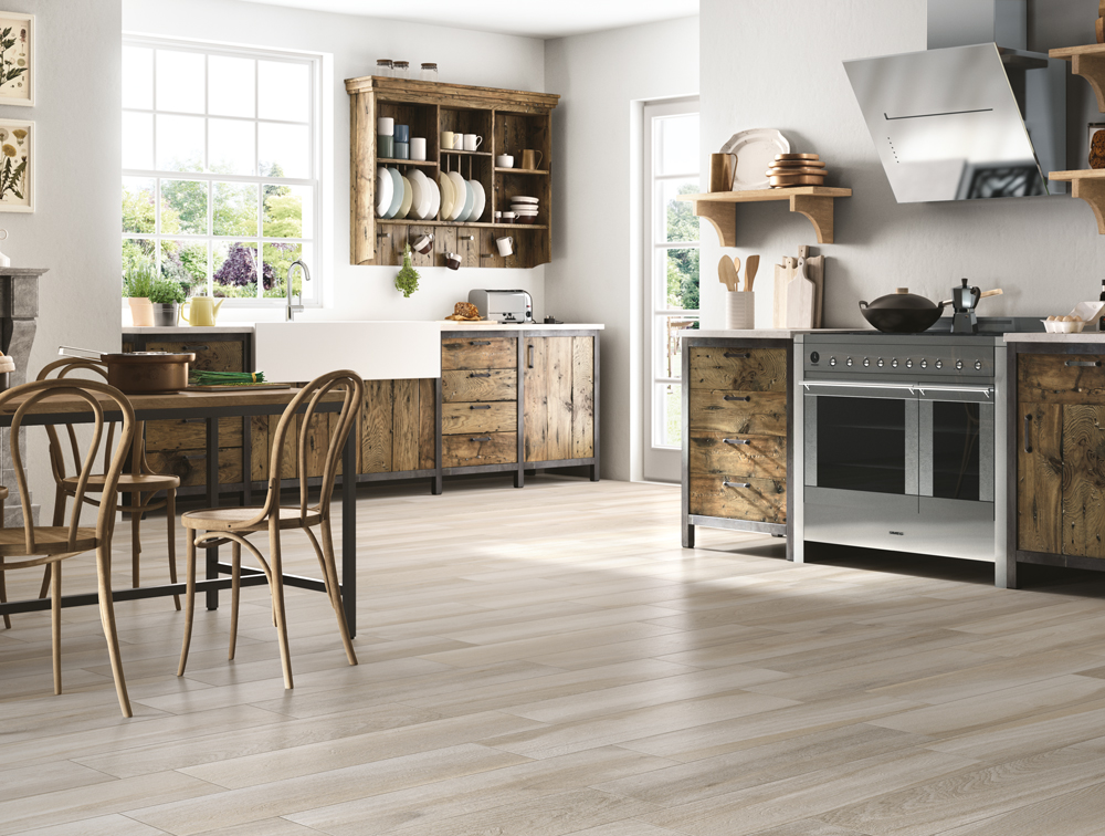 Today wood-look porcelain stoneware in the shabby-chic style effortlessly recreates every nuance of this look. To the untrained eye, its appearance is practically identical to that of natural wood. Furthermore, it offers a range of outstanding practical benefits, like resistance to scratches, impact, and moisture, making it perfect for shabby-chic kitchens and bathrooms.
