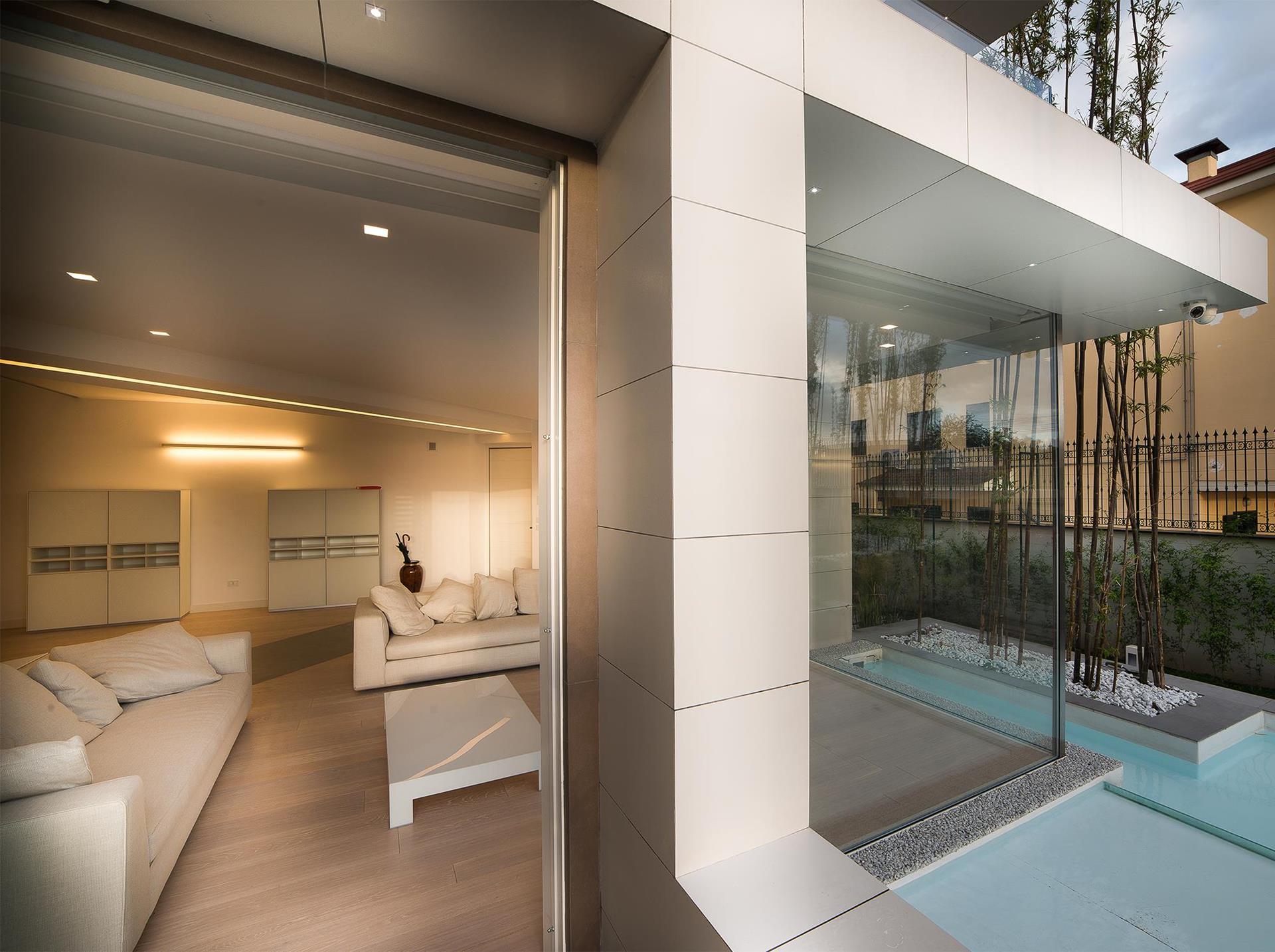 A major element of the project, strongly desired by the client, is the dialectic between the inside and the outside of the house, which is resolved through a series of formal solutions which provide for continuity between the living spaces and the green surroundings of the house.