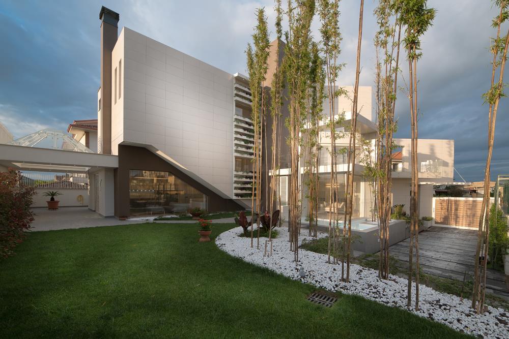 The concept of this independent private house is a synthesis of the ideas and personality of the owner, who wanted to blend architectural sensitivity, technological practicality and the pragmatism typical of a strong entrepreneurial spirit. Villa Affinito fits into the traditional Casertano territory as an unprecedented experiment involving geometries and materials in a dynamic game of transparency and volume.