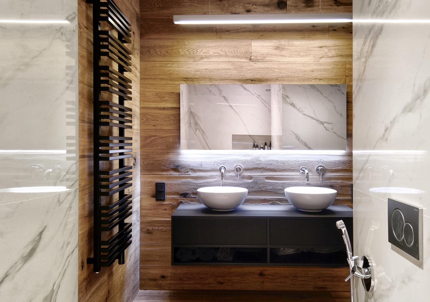 Cotto d’Este was chosen to cover the horizontal and vertical surfaces of the bathroom, where the ultra-thin large-format 100x300 cm ceramic slabs from the Kerlite 5plus Custom-Made were used, with a thickness of 5.5 mm.